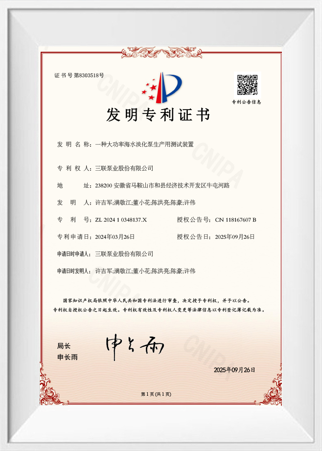 Un dispositivo de prueba para la producción de bombas desalinizadoras de agua de mar de alta potencia.